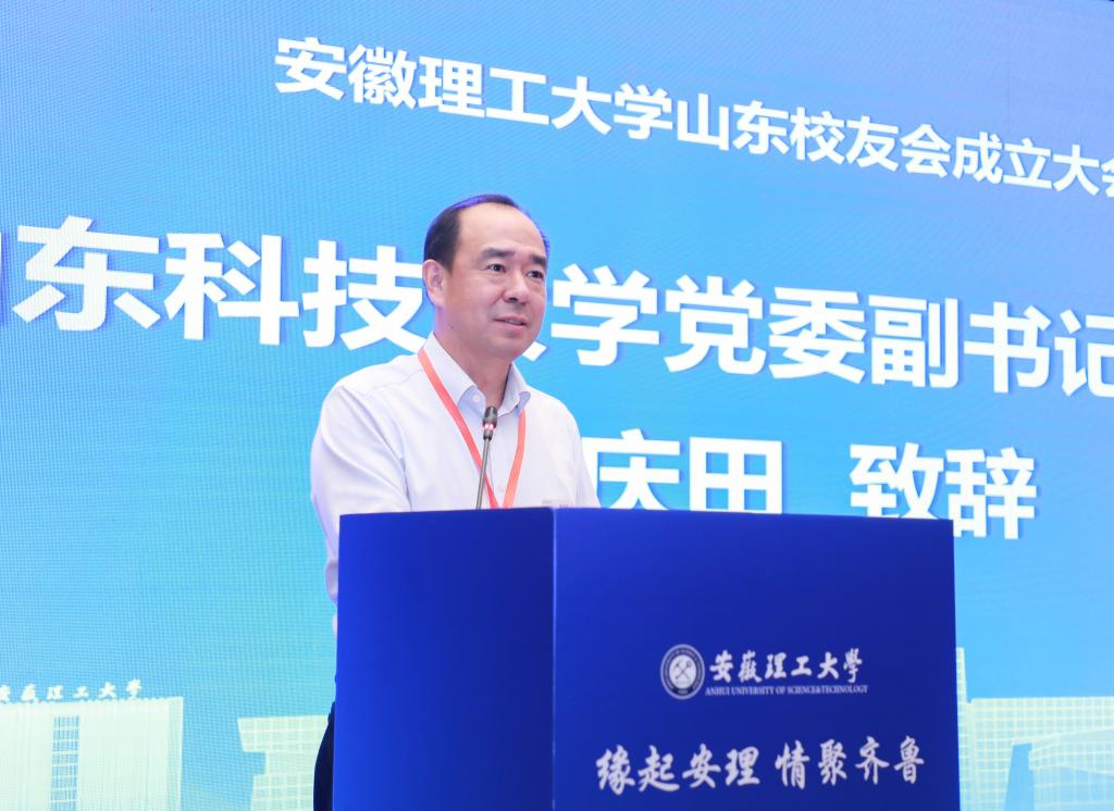 曾庆田致辞。他代表山东科技大学向学校山东校友会的成立表示祝贺!他强调,两校之间非同寻常的历史渊源与深厚情谊,不仅是历史上的兄弟,更是发展道路上携手同行的伙伴!在长期合作交流过程中人才交流频繁、科研合作广泛,希望双方在已有良好合作的基础上,汇聚校友力量、聚焦科教融合、深化战略协同,携手为行业高质量发展注入新动力、提供新支撑。