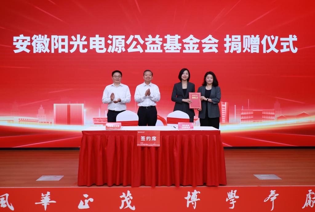 在袁亮、安徽阳光电源公益基金会理事长李秋宜共同见证下,余玉刚与安徽阳光电源公益基金会秘书长金蓓签订捐赠协议。