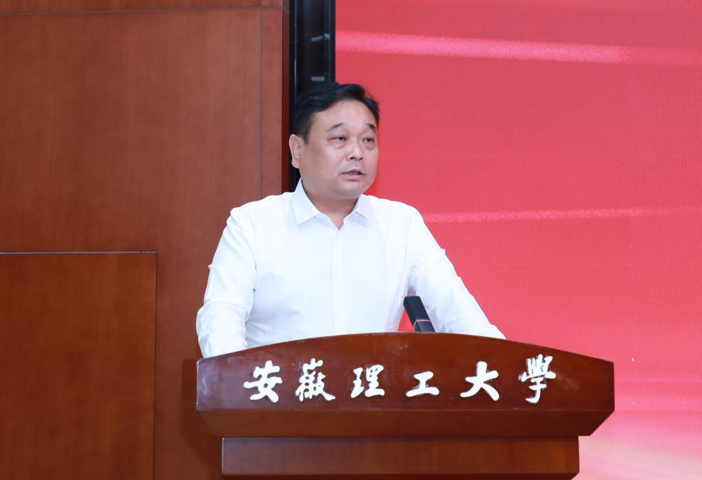 朱庆龙致辞。他表示,恒大江海与安徽理工大学合肥校区仅一路之隔,“地缘近邻”的优势为校企合作提供了天然便利,设立“恒大江海奖学金”,旨在助力学校高层次人才队伍建设,同时以实际行动推动校企协同发展,共同打造校企协同创新“安徽样板”。他强调,恒大江海愿与安徽理工大学深化合作,在科学研究上“同频共振”,在人才培养上“同向发力”,在服务国家战略上“同心致远”,携手为国家矿山安全保障、能源安全供应及高素质人才培育贡献更大力量。