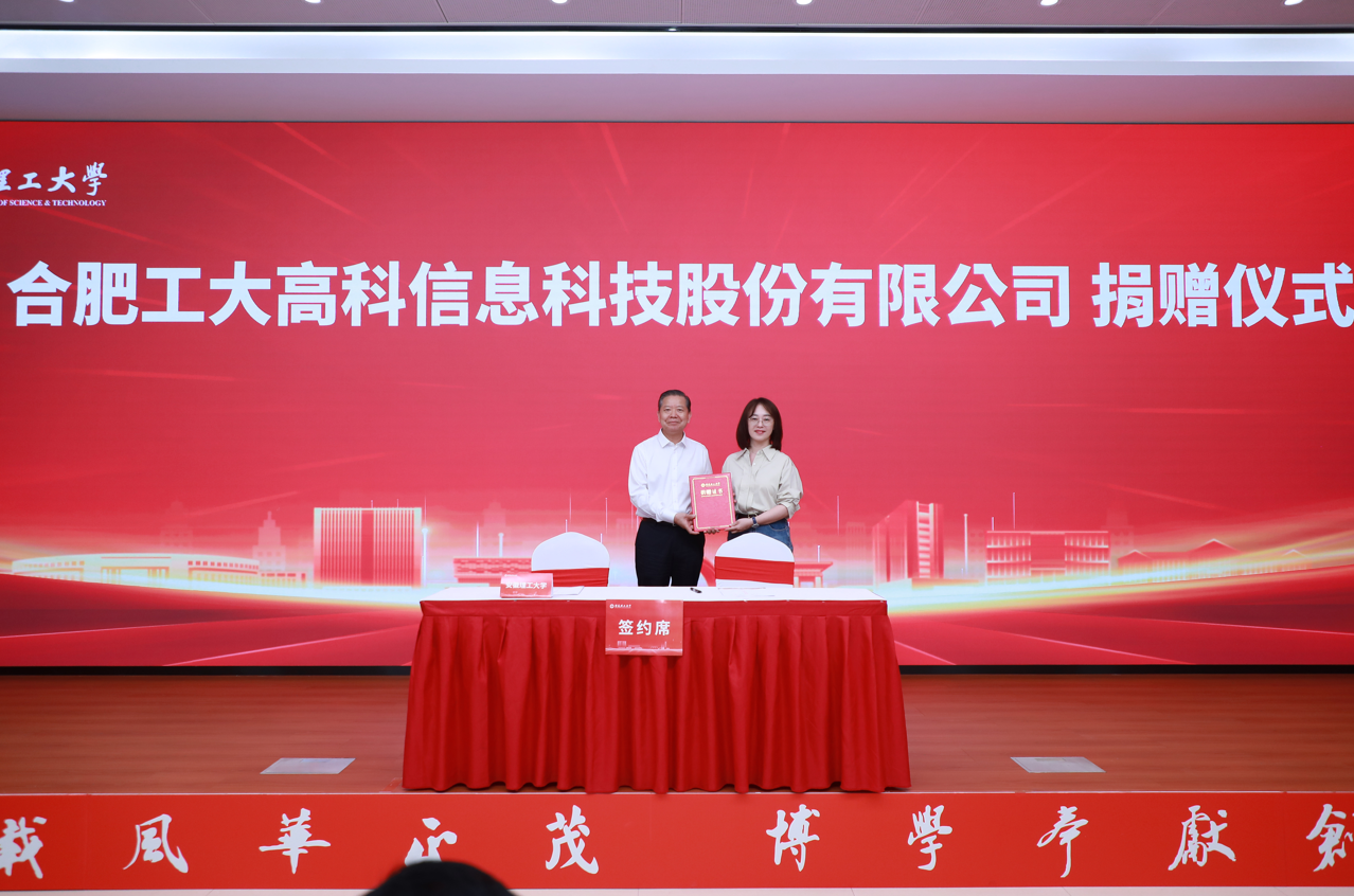 袁亮向合肥工大高科信息科技股份有限公司总裁助理赵蕊颁发捐赠证书。