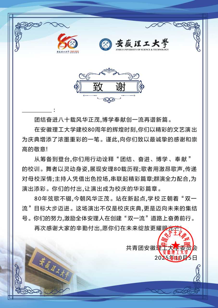 站在新起点,学校正朝着“双一流”目标大步迈进,这场演出不仅是校庆庆典,更是迈向未来的集结号。学校将传承80年薪火、不断守正创新,继续深耕教育沃土,勇担时代使命,为培养更多担当民族复兴大任的时代新人、为建设教育强国和实现中华民族伟大复兴的中国梦,阔步新征程,昂首向未来。