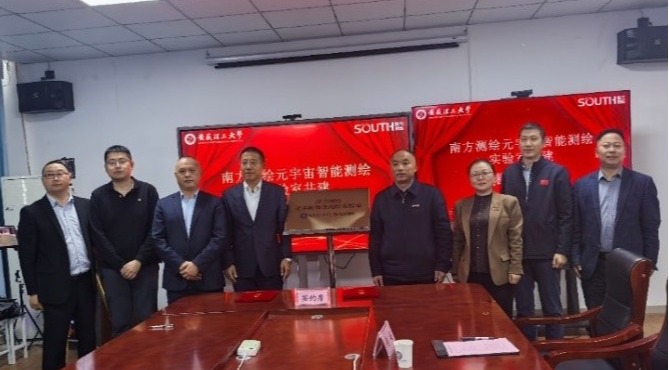 张平松与郭宝宇共同为实验室揭牌。王磊代表学校与南方测绘集团签约。
